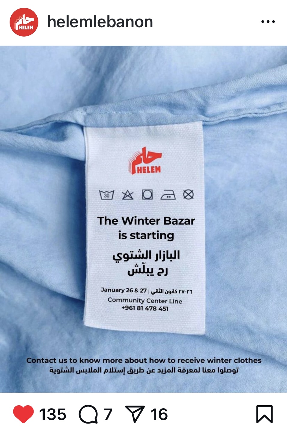 Announcement post on the NGO’s Instagram platform for the Community Center to announce the launch of the annual winter clothes drive event.
