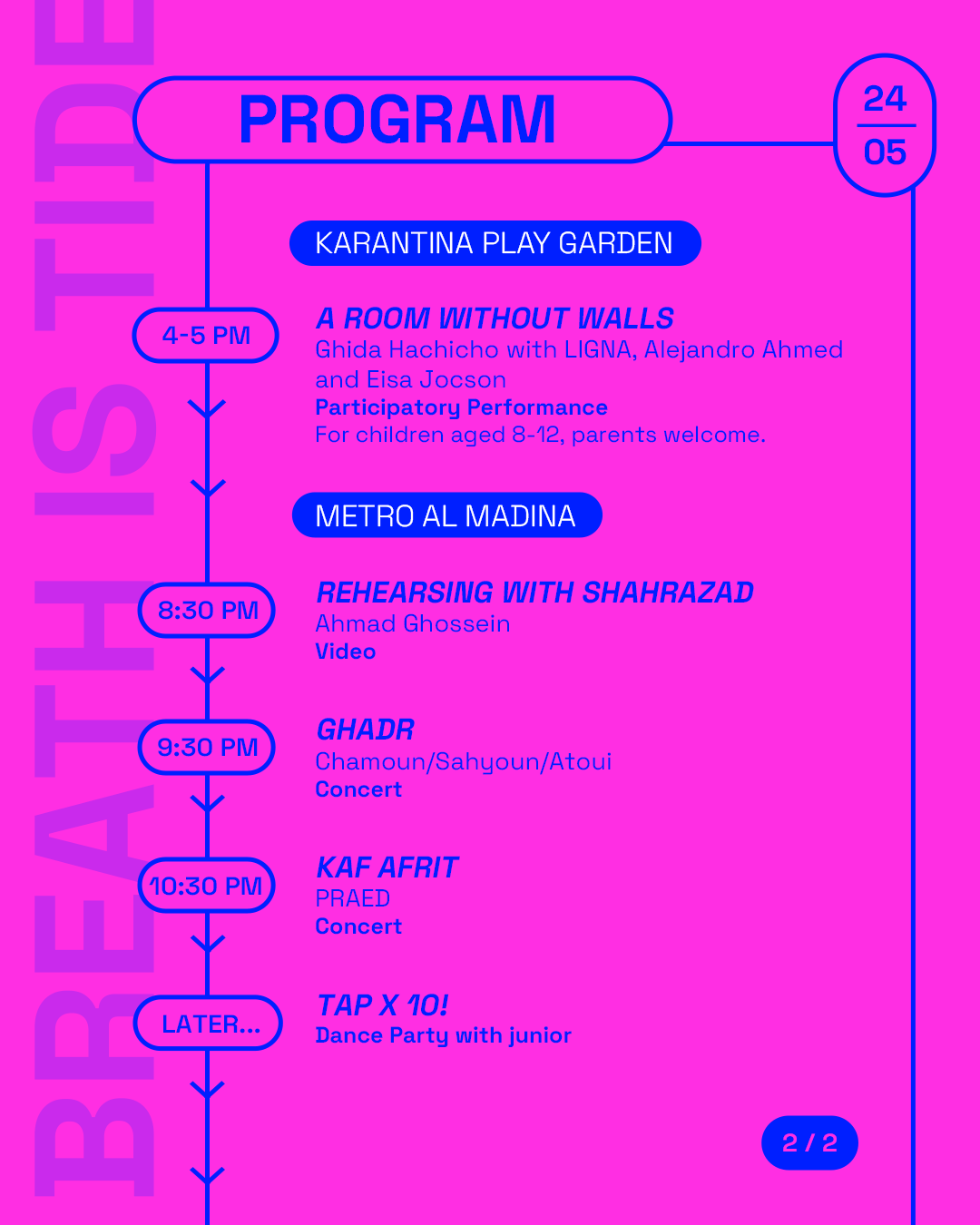 Poster for Breath is Tide events happening at Metro al Madina, Beirut, LebanonThe main pamphlet took the form of an accordion-fold leaflet, printed on inexpensive, brightly colored paper to enable wide distribution. The design folds into a circle, echoing a verse from Birago Diop’s poem Breaths, which served as a conceptual anchor for the curatorial direction. The full program, printed on A2 paper, provided generous space to clearly present information, such as project descriptions or a visual institutions map, to TAP’s diverse audiences.